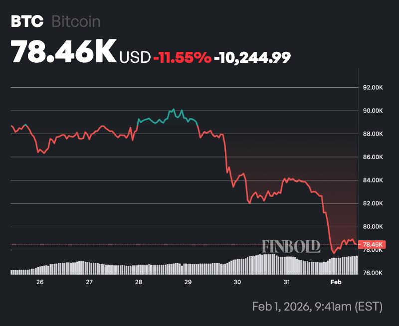截至发稿时,比特币价值为 78,461 美元,过去 24 小时内下跌超过 6%。按周计算,加密货币已修正超过 11%。