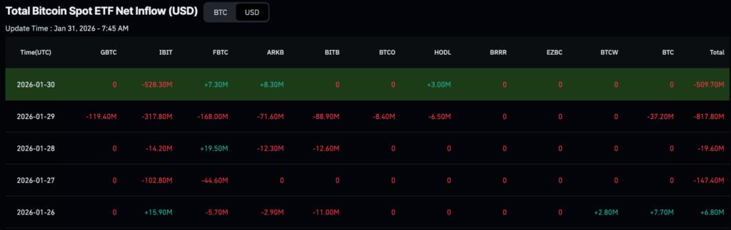 比特币抛售潮最猛烈的时期出现在本周临近结束时。1月29日,IBIT录得约3.18亿美元的净流出,第二天又出现了更大的5.28亿美元净流出。