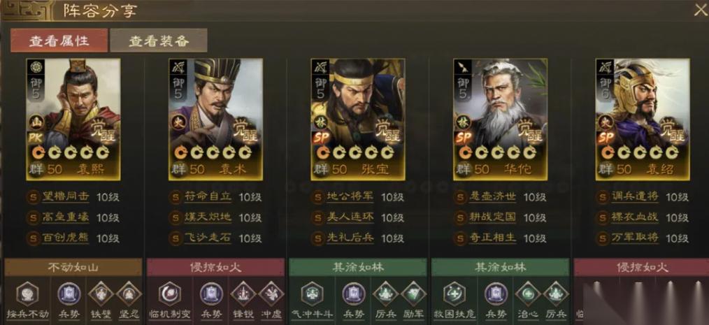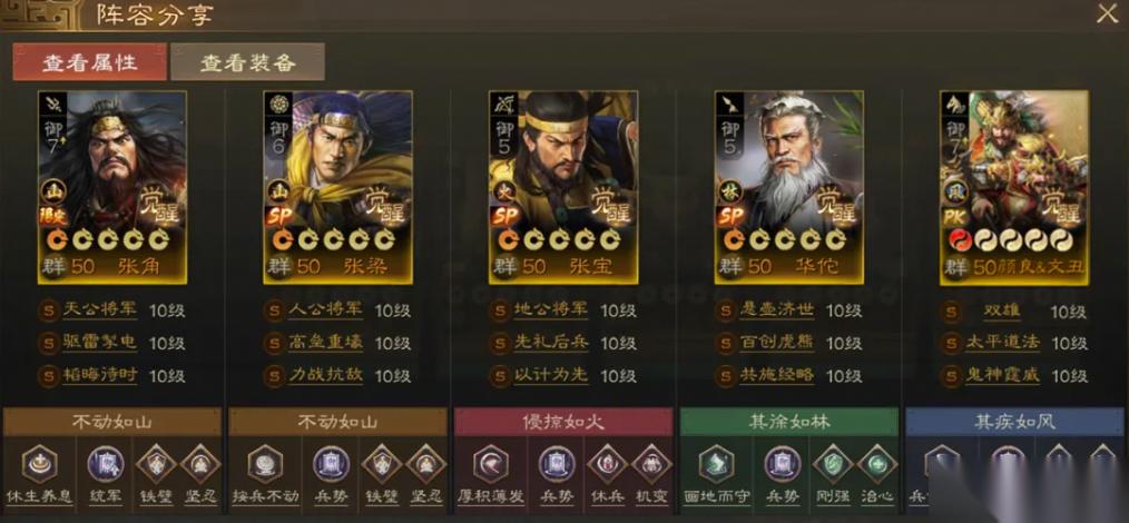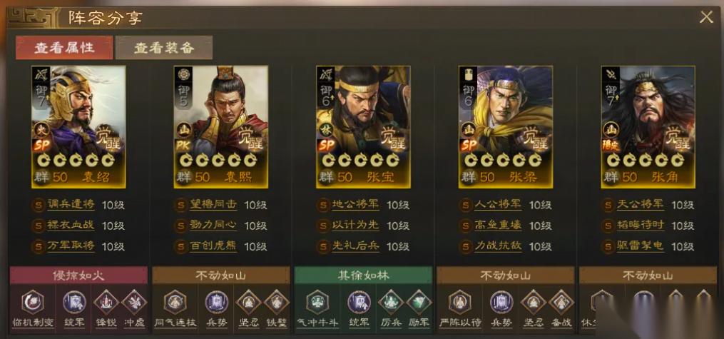二袁三张这套组合包含了2名肉盾和2名输出,袁熙和SP袁绍是一对,张梁和SP张角是一对,SP张宝则在中间辅助,无论【地公将军】给到谁,都能提升对应武将的输出能力。