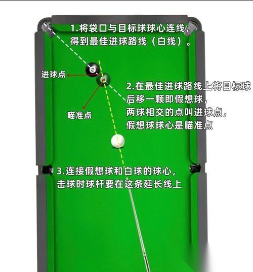 4.瞄准技巧之直线瞄准法:直线瞄准法是一种简单但有效的瞄准技巧,通过判断球和袋口之间的直线来确定击球的方向和力量。