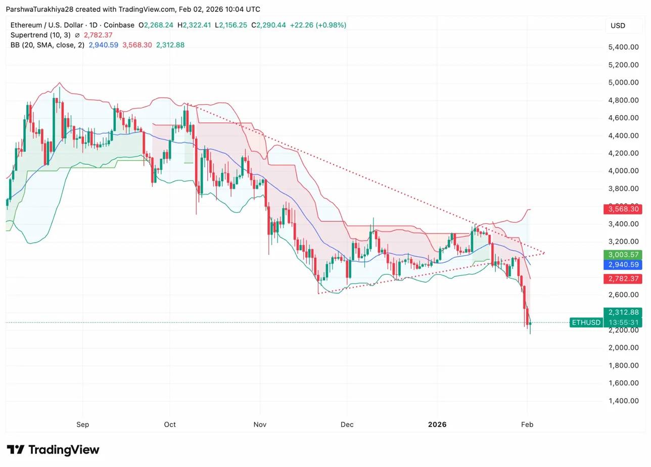 以太坊价格今日在2290美元附近交易,此前曾暴跌至2156美元,创下自2024年10月以来的最低水平。以太坊的暴跌与比特币跌至74500美元的行情同步,后者是由特朗普提名鹰派美联储主席以及伊朗港口爆炸事件引发的。然而,以太坊的表现远逊于比特币,跌幅超过20%,而比特币的跌幅为15%。