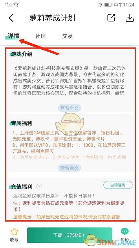 6、在【详情】界面,可看到“游戏介绍”、“专属福利”、“充值福利”等内容,可以更好的了解游戏内容和折扣福利,