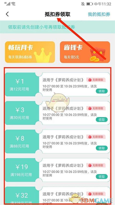 10、在【折扣券】界面,可领取该游戏的代金券,进行消费充值的时候可以抵扣现金,