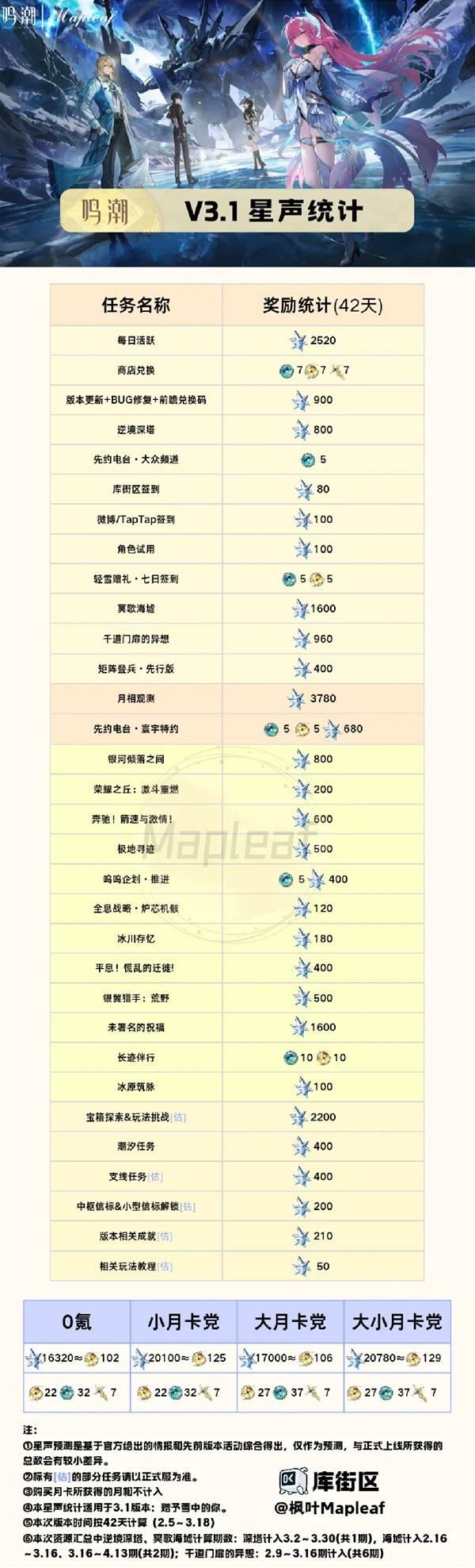 1、部分活动参考了先前版本星声数量,可能存在部分差异。
