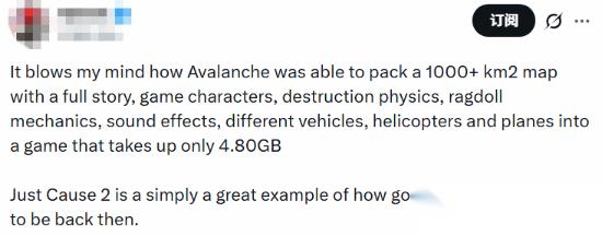 “简直令我难以置信,Avalanche工作室竟然能将一个超过1000平方公里的地图、完整剧情、游戏角色、破坏物理效果、布娃娃物理系统、音效、各类载具、直升机与飞机全部塞进一个仅占4.80GB容量的游戏中。”