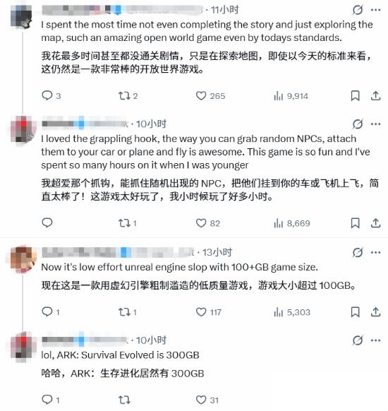 楼主回复:“我太爱那个抓钩了,你可以随手抓住NPC,把他们粘在你的车或飞机上然后起飞,这真的太酷了。这游戏好玩极了,我年轻时在上面花了无数个小时。”