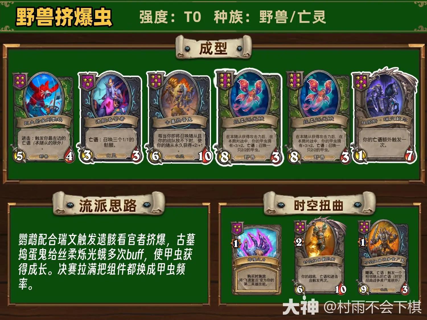 鹦鹉配合瑞文触发遗骸看官者挤爆,古墓捣蛋鬼给丝柔烁光蛾多次buff,使甲虫获得成长。决赛拉满把组件都换成甲虫频率。