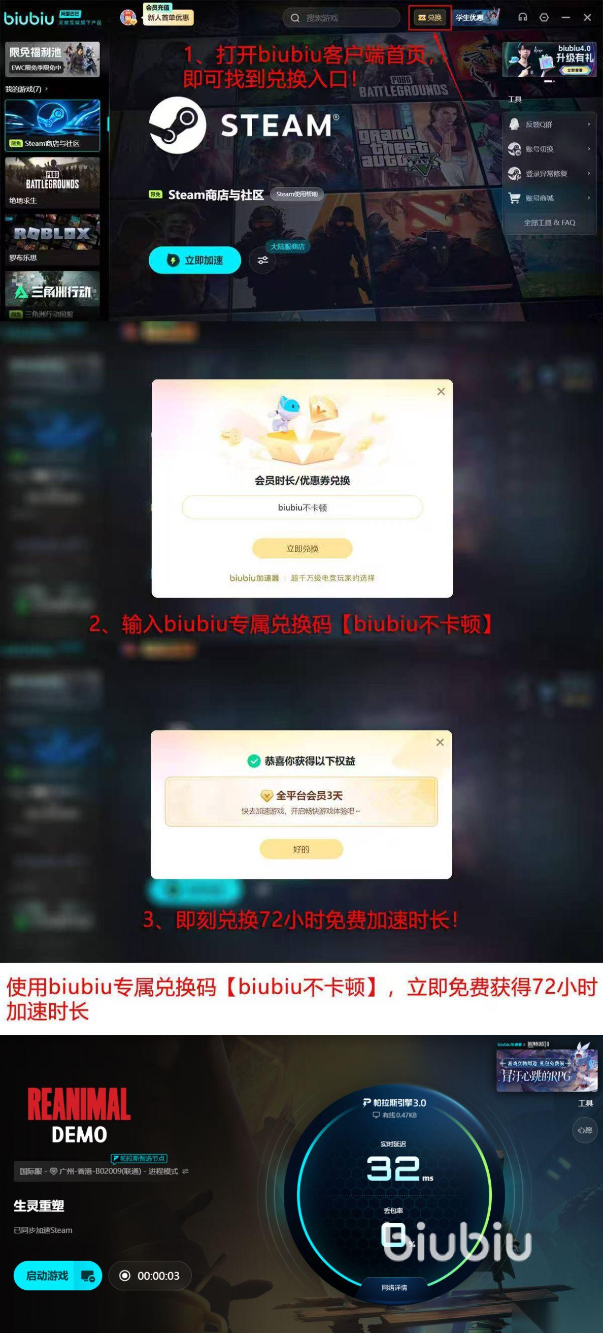 除此之外,平台还长期给新人提供24小时体验福利,在大家首次注册时就可以享受,平台自动发放。若小伙伴们不兑换上方的7天活动时长,那么还可以选择使用兑换码【biubiu不卡顿】兑换三天体验时间,该福利是长期有效的,并且兑换的时间内可以提速任意游戏,不过三天兑换码和7天兑换码是互斥的,新人只能选择其中之一的福利,若是大家之前已经领取过三天福利了,那么上方的7天福利则无法领取。