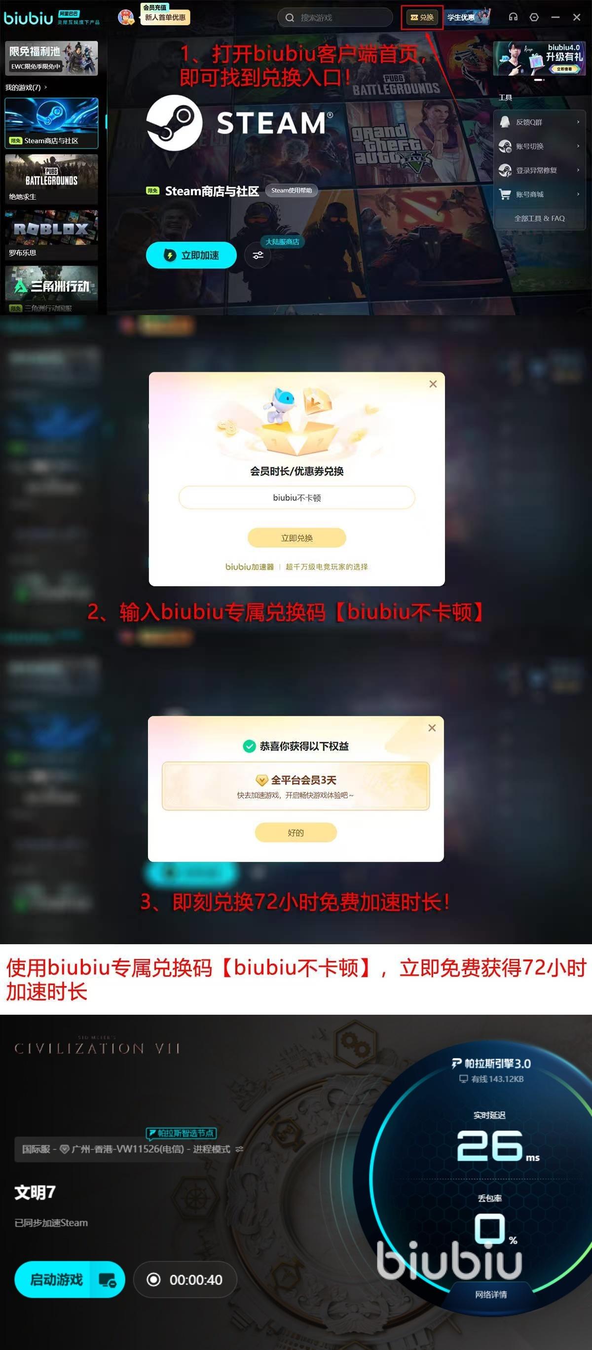 现在加速器对于新用户还有着不错的福利,现在新人在第一次进入到加速器的时候他可以享受到24小时的免费加速时间。使用兑换码【biubiu不卡顿】还能额外获取到3天免费加速时间,总计可以获得96小时的免费加速时间。