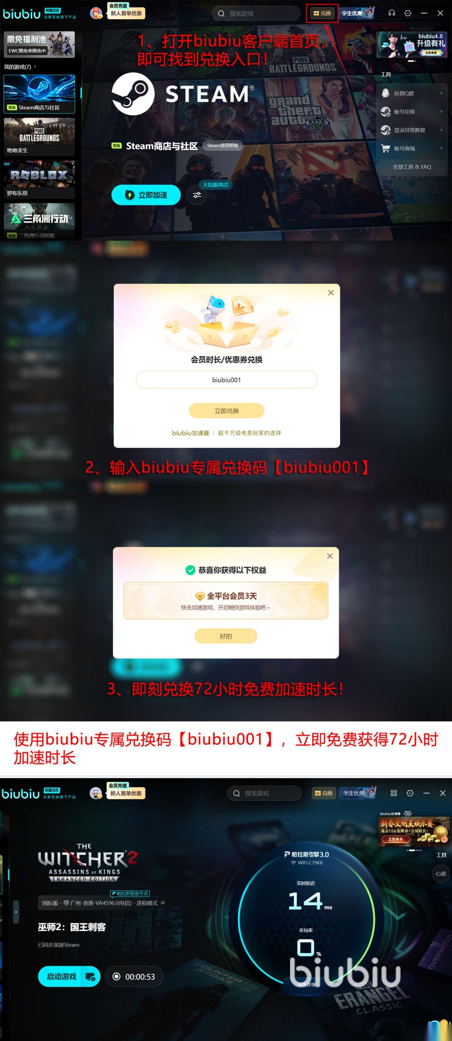 拥有特别好的影响力,也覆盖不同的场景,比如多端或者是不同的区服都可以轻松使用,其中还包括上万款不同的游戏类型,每款游戏的加速方式都极其简单化。控制按键就可帮助大家顺利完成,如今也是携带着满满的诚意呈现在大家的眼前,新人只要注册之后就可拥有24小时,而再次输入【biubiu001】还能额外获得三天的免费时长,那么这样共计就可达到96小时。