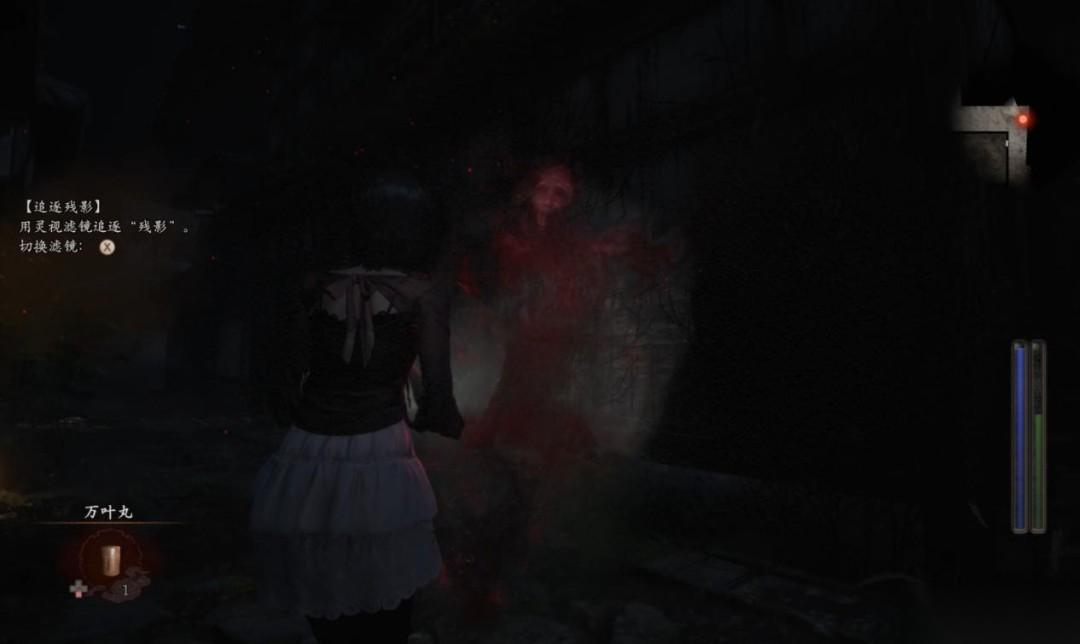 无剧透剧透:《零 ~红蝶~》同时也是个妹妹找姐姐的故事,第一章刚结束,姐姐天仓茧便被村子里的怨灵勾引走了,而妹妹天仓澪只好循着她的踪迹一路狂追。在这个过程中,“灵视”滤镜既不会破坏游戏氛围,又起到了引导的作用,尤其是在本作整体昏暗的环境中,这一功能也保证了玩家能够拥有清晰的游戏目标,不会像个无头苍蝇一样在村子里瞎转。