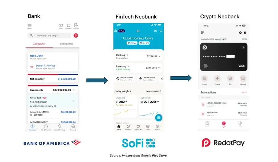 与加密货币类似,新银行在 2008 年金融危机后迅速崛起。与传统银行复制实体网点布局不同,新银行以技术平台的形式运营,通过移动界面提供银行服务。大多数新银行在幕后与合作银行携手,提供存款保险和合规基础设施,同时维护前端客户关系。凭借快速的注册流程、透明的费用和数字化优先的设计,许多新银行已成为用户存储、消费和增值资金的首选平台。