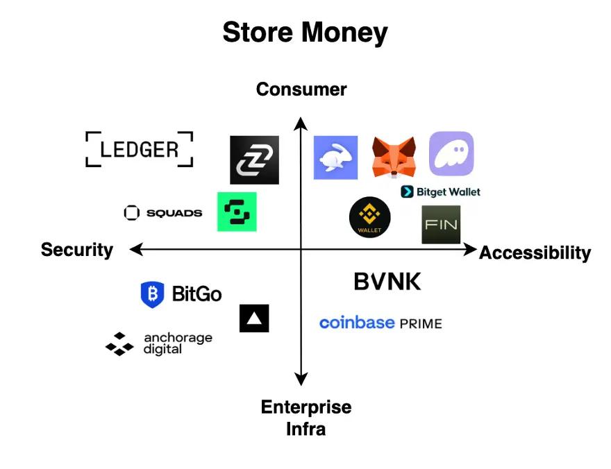 如果要妥善进行自托管加密资产并与区块链交互,用户必须拥有某种加密钱包。粗略地说,可以从两个维度对加密钱包市场进行分类:“安全性与易用性”,以及“消费者应用与企业基础设施”。每个维度都涌现出一些具有强大分销能力的佼佼者:Ledger 提供安全可靠的面向消费者的硬件钱包;Fireblocks 和 Anchorage 提供安全的企业级钱包基础设施; Mask、Phantom 和 Privy 等面向消费者的钱包专注于提升易用性和用户体验;而 Turnkey 和 Coinbase Prime 则占据了更多易用的企业级基础设施市场。