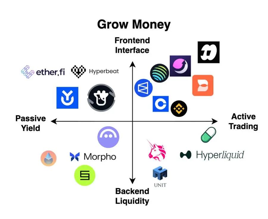 “加密新银行”与其客户之间的第三种关系是“增值”能力。这是加密货币领域创新程度最高的领域,加速了众多从 0 到 1 的底层技术的发展,例如质押金库、永续合约交易、代币发行平台和预测市场。与之前一样,可以从两个不同的维度对帮助“增值”的应用进行分类——从被动收益到主动交易,以及从前端界面到后端流动性。