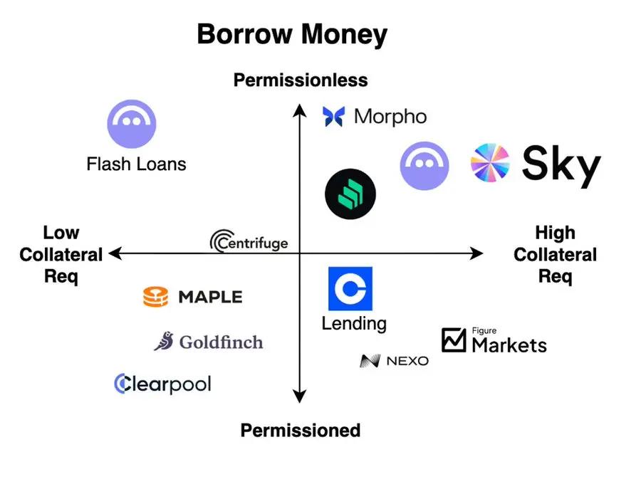 当今加密货币领域的主流模式是无需许可的链上系统,并要求超额抵押。Aave、Morpho 和 Sky(前身为 MakerDAO)等去中心化金融巨头秉持“代码即法律”的理念,体现了加密货币的精神:由于区块链本身无法获取用户的 FICO 信用分或声誉信息,因此它们要求通过超额抵押来保证偿付能力,以牺牲部分资本效率为代价,换取更广泛的可用性和防止违约的安全性。Morpho 尤其代表了该模式的下一代演进,它引入了更模块化、无需许可的系统,并采用更高效的风险定价机制,从而提高了资本效率。