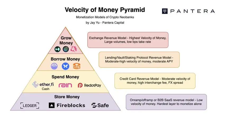 然而,这仅仅是旅程的开始。构建一个全栈式的“加密新银行”远不止推出一张加密卡或一个带有用户界面的简单钱包协议那么简单。与金融科技新银行类似,加密新银行需要考虑其切入受众是谁——无论是“为没有银行账户的人提供银行服务”,还是为新兴经济体的商家提供无缝的稳定币二维码支付——并迅速扩展其产品组合。虽然每个银行业务领域——存储、消费、增值和借贷——都有其自身的变现模式和权衡取舍,但收入都源于对“价值流动”的利用。从这个角度来看,加密新银行最大的机遇或许在于资金周转速度快的领域——借贷——然后再沿着“货币流通速度金字塔”向下拓展到消费和存储领域。