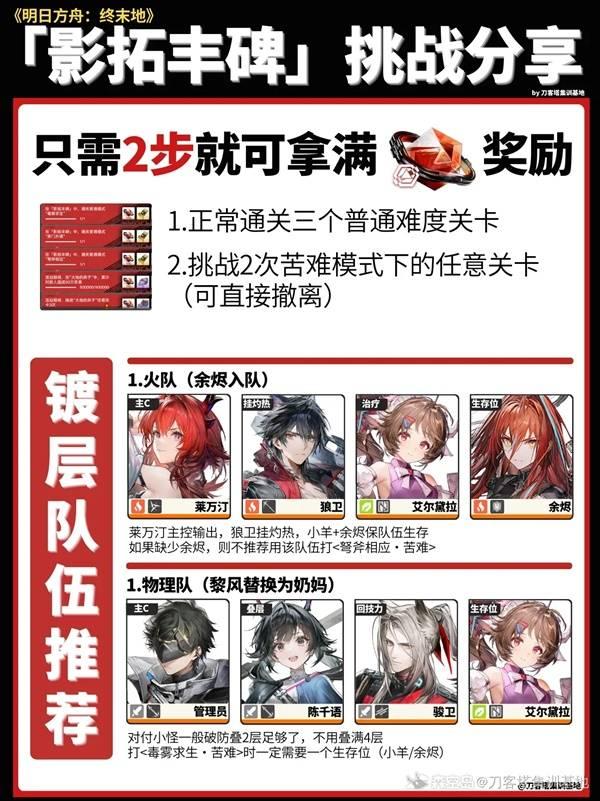 《明日方舟终末地》中有许多玩家想知道影拓丰碑的挑战应该怎么拿到镀层,下面是由“刀客塔集训基地”为大家带来的《明日方舟终末地》影拓丰碑镀层队伍推荐,希望能够对大家有所帮助。
