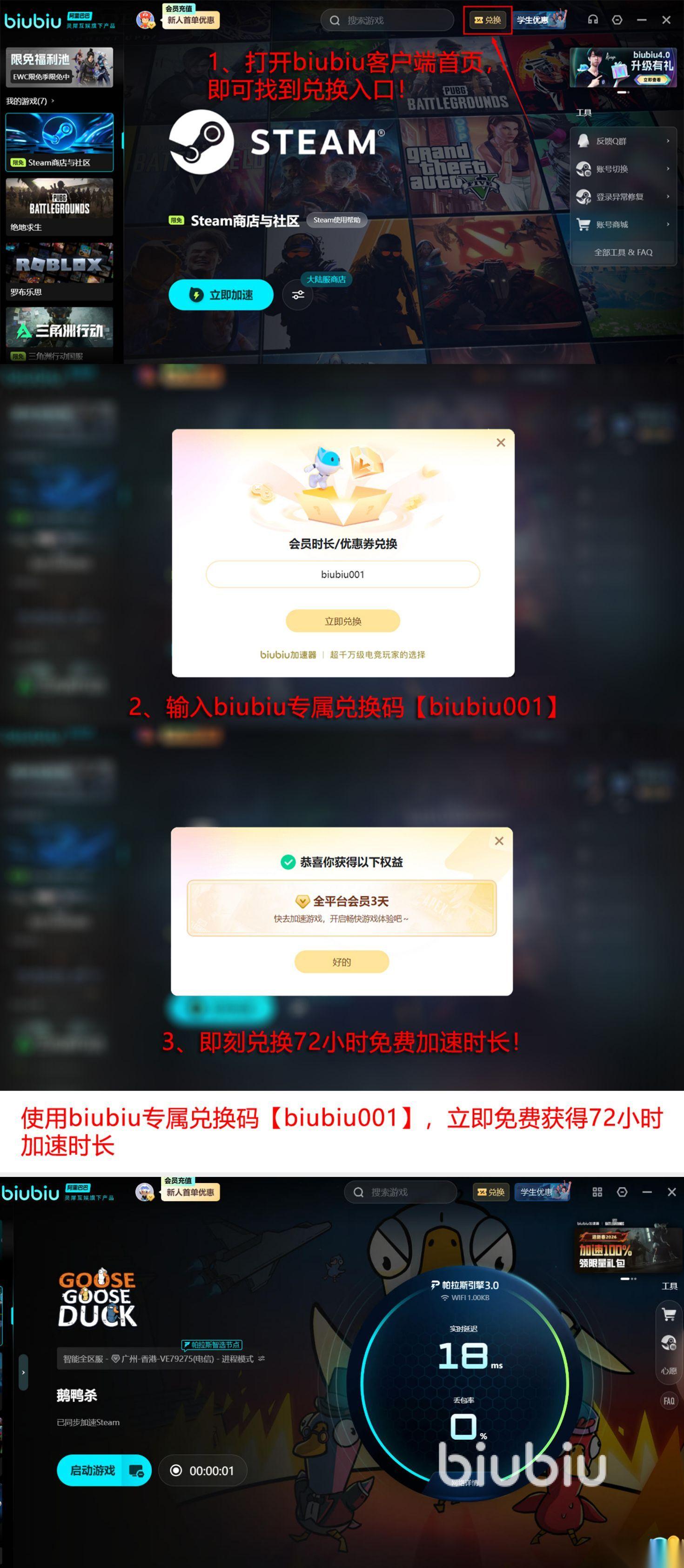 如果你不喜欢上面的指定游戏加速,也可以参与这个活动,为了能够让玩家体验显著效果,当前推送出一系列福利活动,新用户登录注册完成实名认证,便可获得24小时免费加速时长,使用兑换口令【biubiu001】获得全平台三天免费加速时长,所有新老玩家全部都可参与,总计96小时。这2个活动兑换码只能参与一次,不可同时参加兑换。