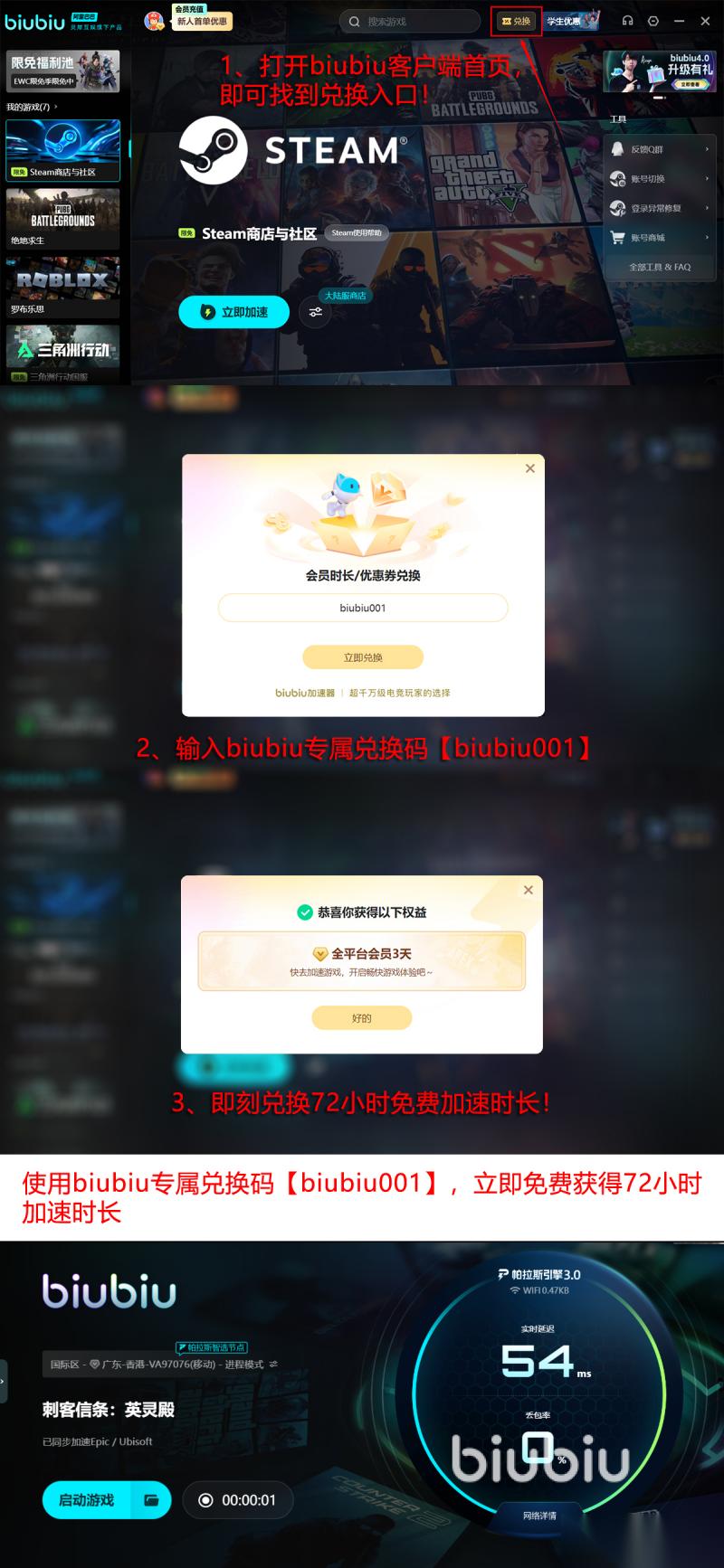 可能之前很多人也踩过雷,体验过不同的工具,但是此加速器却不需要大家担心,因为覆盖的领域比较多,已达到上万款不同的游戏。其次目前也携带了大量的福利政策重磅来袭。首先当我们用账号注册之后,就立即会获得24小时的加速时长。那之后所有的人都可以用【biubiu001】,成功兑换三天的免费加速特权。当然了,新人还是比较有福气的,这两种方式同时使用后,免费加速的时长就达到96小时。