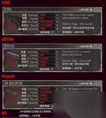 手枪类武器虽然火力相对较弱,但在近战时仍然有着不可忽视的作用。本段将介绍.44Magnum、M9等手枪的伤害数值和射击速度等特点。