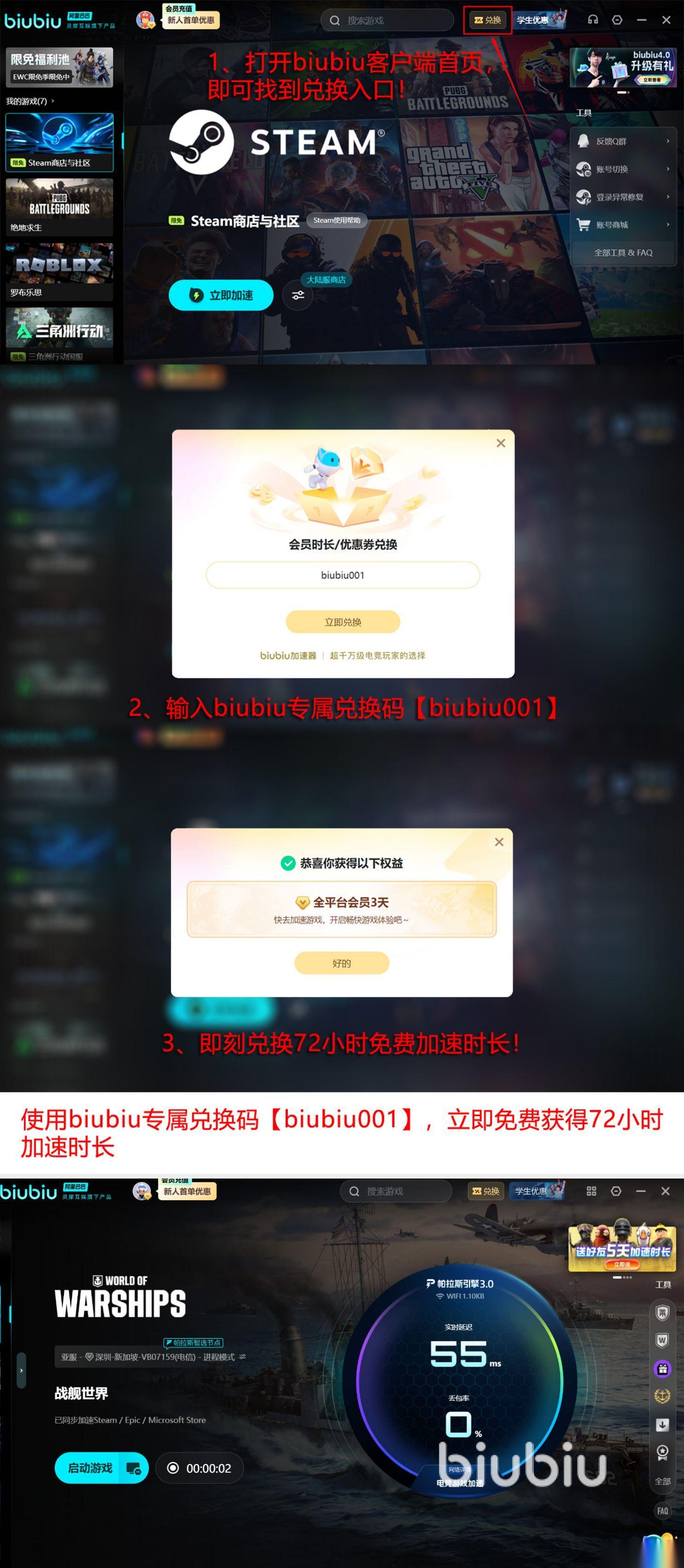 其次在福利方面更是出于大家的内心想法,想体验的话,就可以采取两种方式来领取免费的福利时长,首先大家成功利用账号激活之后就会拥有24小时的加速特权,使用完之后还可用【biubiu001】,直接领取三天的免费特权,那么这样算下来就可共达到96小时。在这96个小时当中,全平台的游戏都可随时加速。