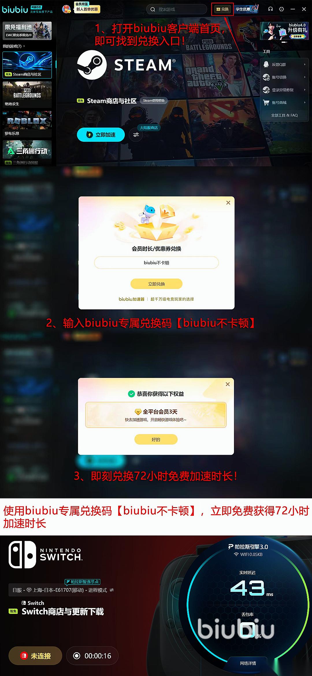 福利方面同样诚意十足,新用户注册无需复杂操作就能免费使用24小时全游戏加速,全体用户只需兑换专属口令【biubiu不卡顿】均可额外增加3天免费加速时长,解锁更长时间的无忧加速体验。