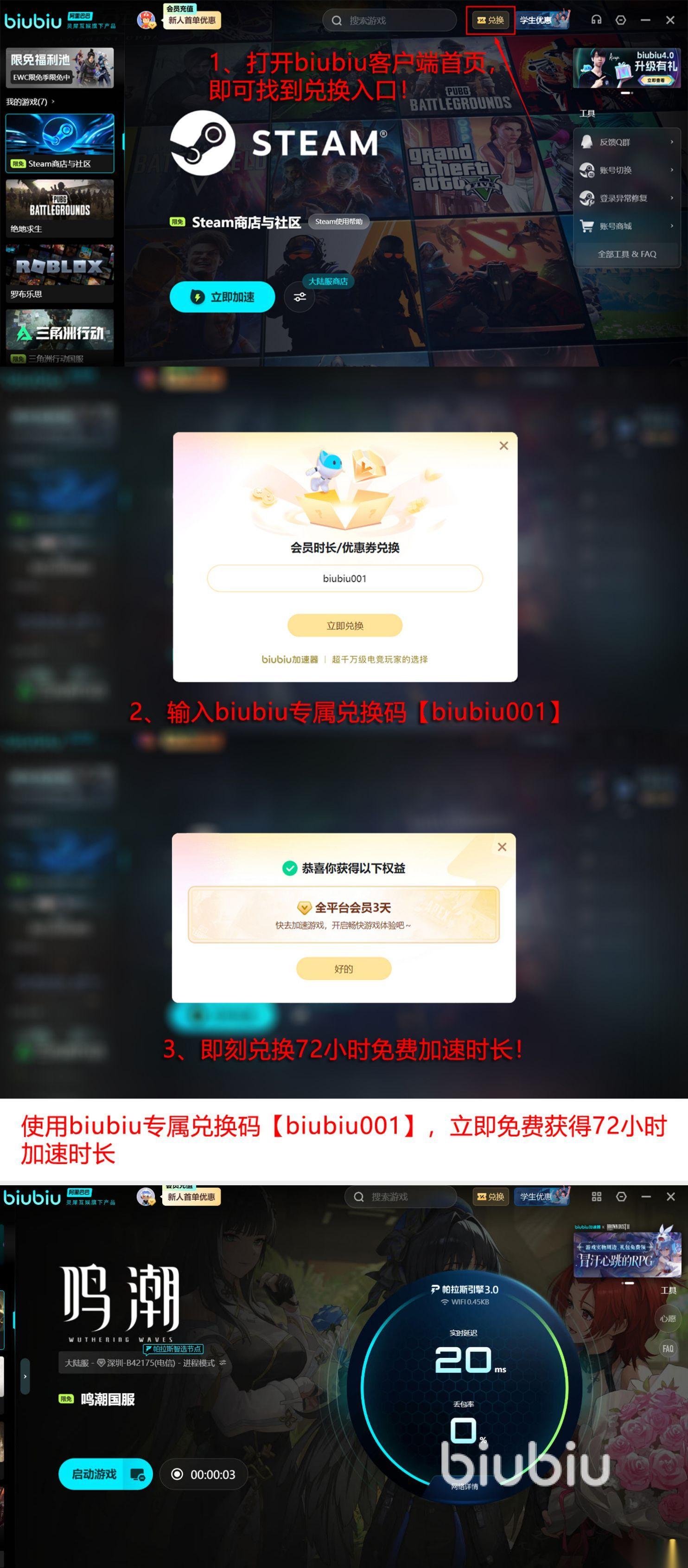 可能对于很多首次体验的用户来说,更关注的就是所带来的福利,从福利方面更是毋庸置疑的,因为当大家首次注册之后,就会拥有24小时的加速特权,使用完之后还可利用【biubiu001】再次获得三天的免费特权。这两种福利都可同时使用,那么时间就可达到96小时,还没有任何的限制,不论是游戏或者是功能等。