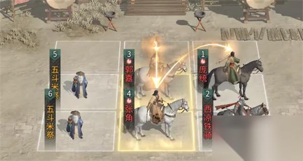 兵种站位:在庞统的下方放置一个西凉铁骑,在郭嘉和张角身后各放置一个五斗米祭。