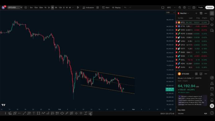 昨天比特币价格最低下探至62,500附近,这一低点正好测试了下跌通道的下边界。测试完成后,价格出现了一段小幅反弹。