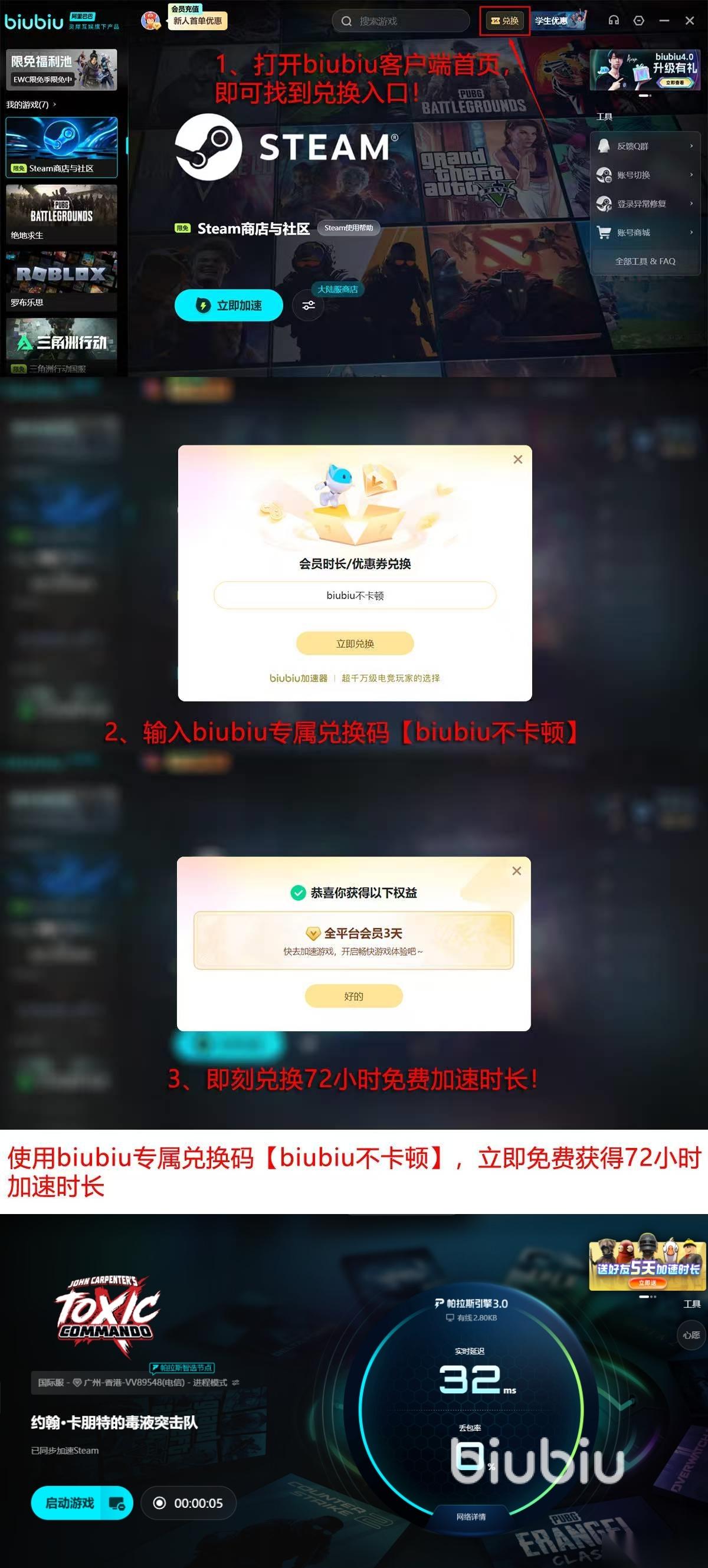 在这个加速器的优化效果下都能有不错的体验,因此就和pubg明星冠军选手xdd达成了合作,此外除了加速效果足够的优秀外,加速器的福利也很不错拥有【biubiu不卡顿】兑换码兑换三天使用时长和新用户注册免费领取24小时使用时长这两种福利活动,可以说福利也是相当的丰厚了。
