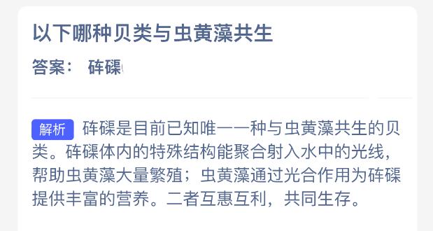 以下哪种贝类与虫黄藻共生?【神奇海洋】2026年2月26日新题目已开答!正确答案现已公布,点击领取拼图,一起为修复海洋生态贡献力量!今日正确答案是:【砗磲】。砗磲是与虫黄藻形成关键共生关系的代表性贝类。