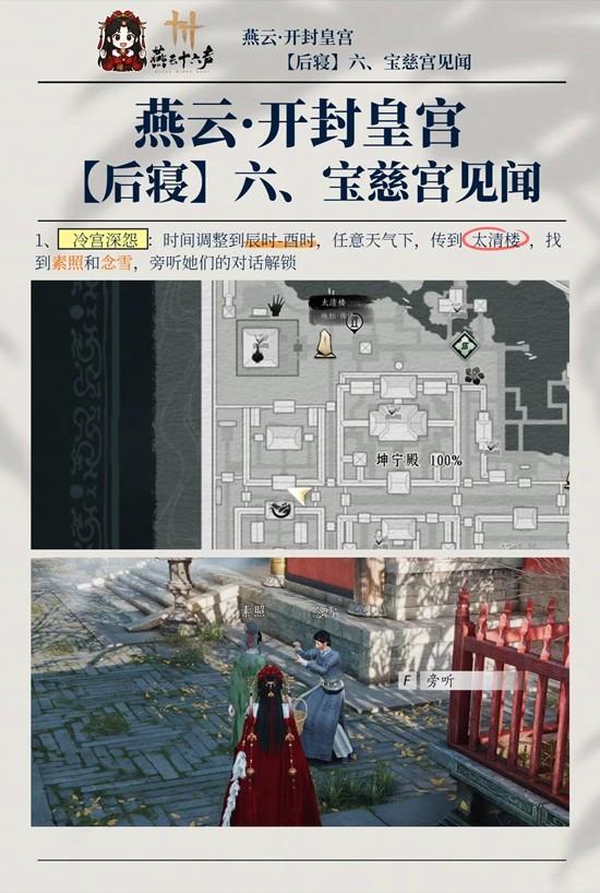 时间调整到辰时-酉时,任意天气下,传到太清楼,找到素照和念雪,旁听她们的对话解锁