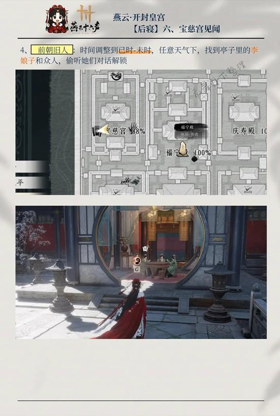 时间调整到已时-未时,任意天气下,找到亭子里的李娘子和众人,偷听她们对话解锁