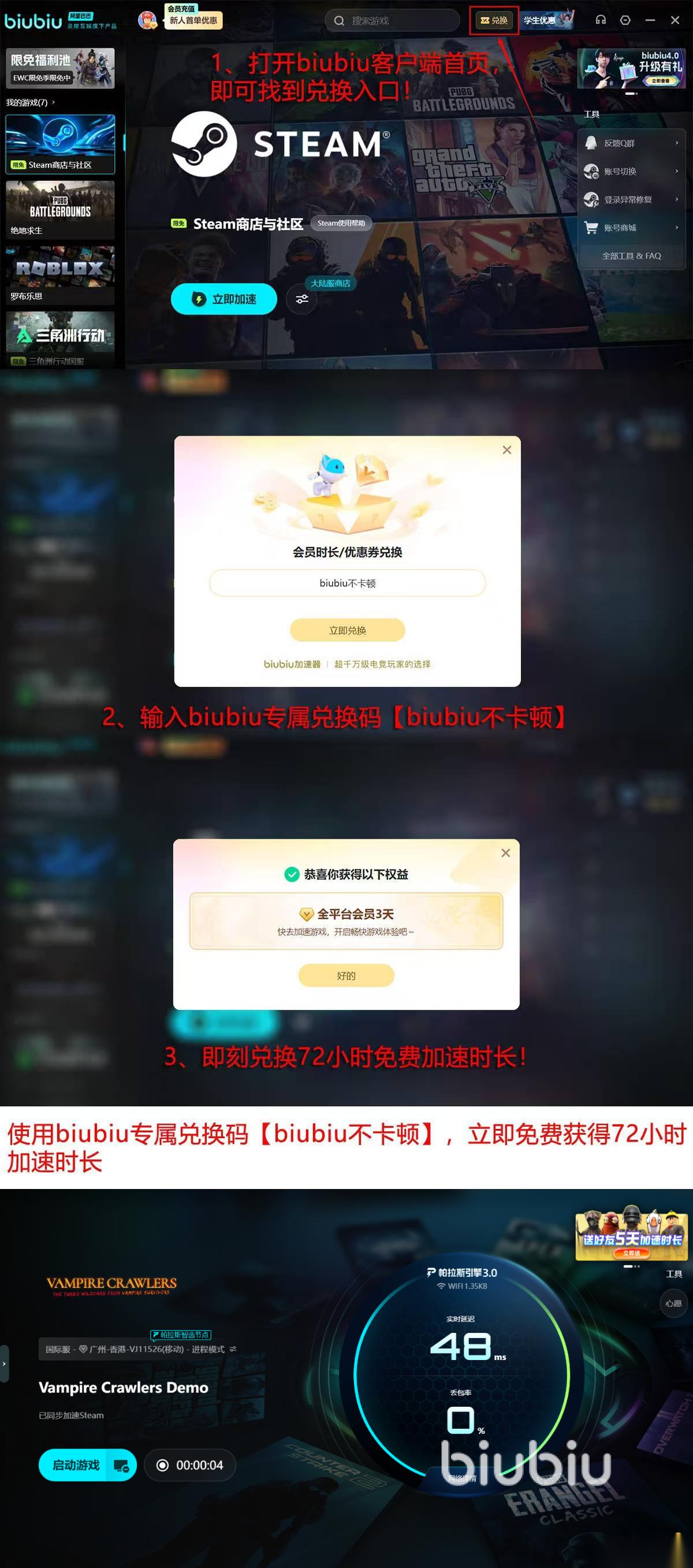 新用户可立即享受专属加速服务:注册之后即刻拥有首日24小时全功能免费体验,输入【biubiu不卡顿】即可再连续享受72小时极速特权,两者叠加可累计96小时超长无阻畅享。