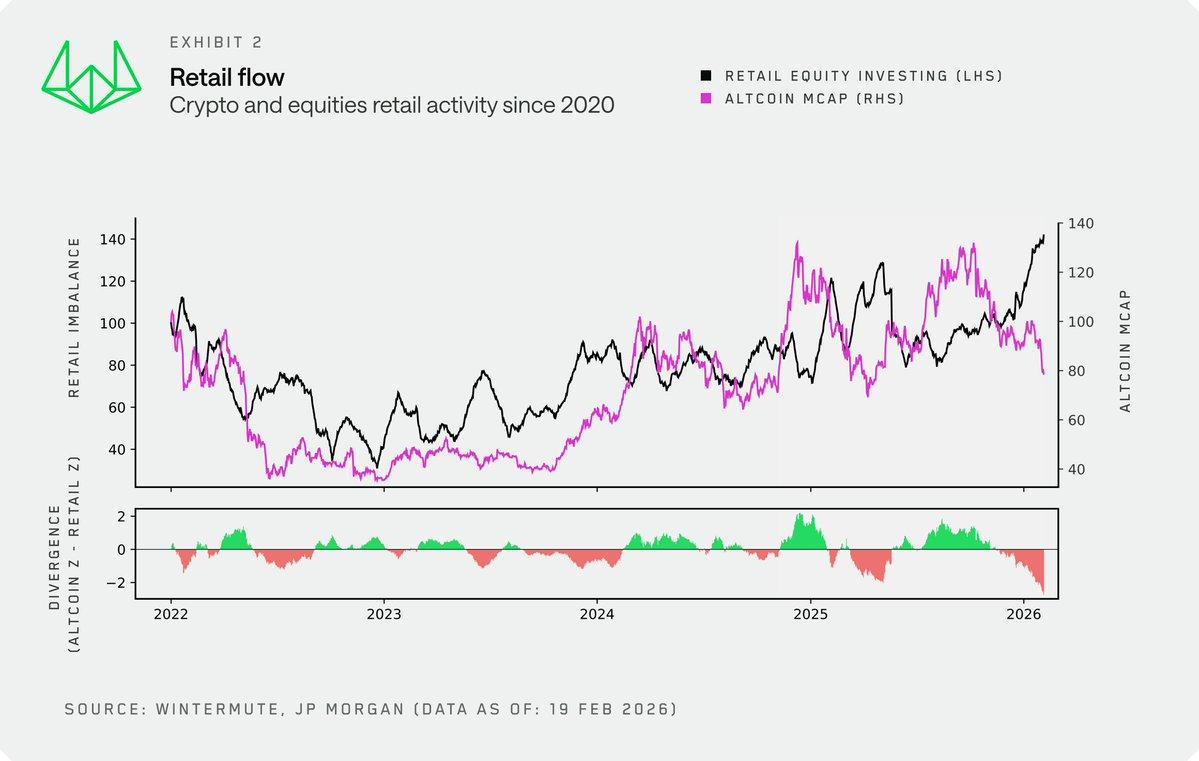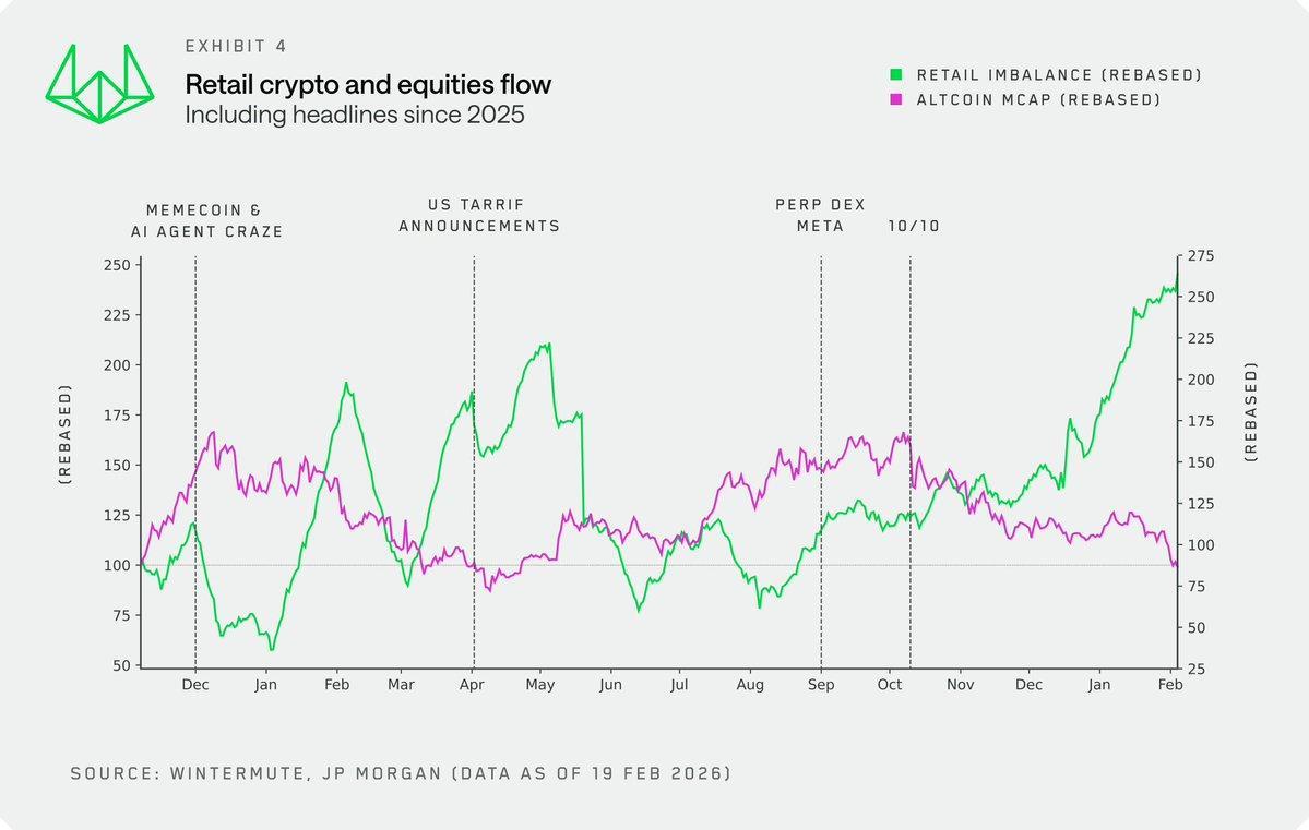 将 Wintermute 独家的加密散户资金流向数据与摩根大通的散户美股资金流入数据叠加对比,我们获得了一个审视散户在美股和加密市场活跃度关系的新视角。