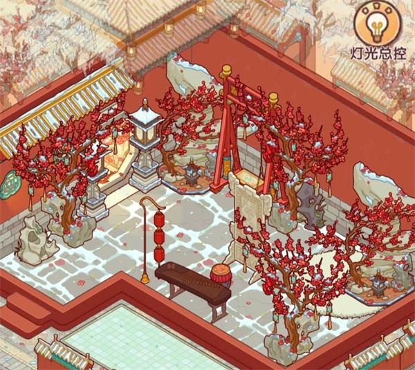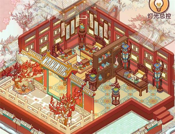 4、第四关:阳台部分大书桌上依次摆放两摞书、茶具,旁边的黄色小桌上摆梳妆镜、小灯,后面靠门口的小书柜上放蔷薇花摆件(藏在靠凤辇的宫灯后面),里面的两张书桌上放部分摆件,靠墙的大小书柜位置如图摆放,梅花摆件放书籍旁边,公鸡摆件放靠外的书柜上面。