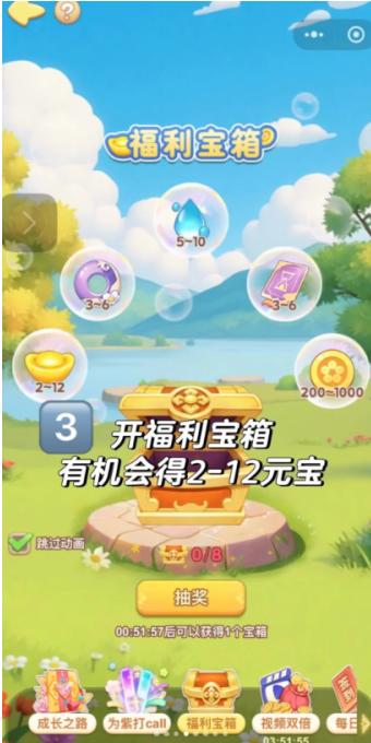 3,开福利宝箱:开一次有机会得2-12元宝;