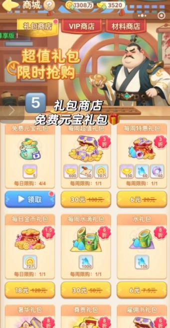 5,商城礼包商店领取免费元包礼包:每天可领4次,分别是5、6、7、8个元宝。