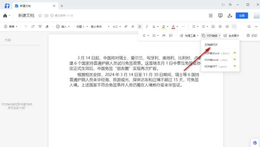 4、那么即可弹出一些选项,将其中的【PDF转换】按钮点击打开,之后我们需要将子选项中的【文档转换PDF】选项进行点击。