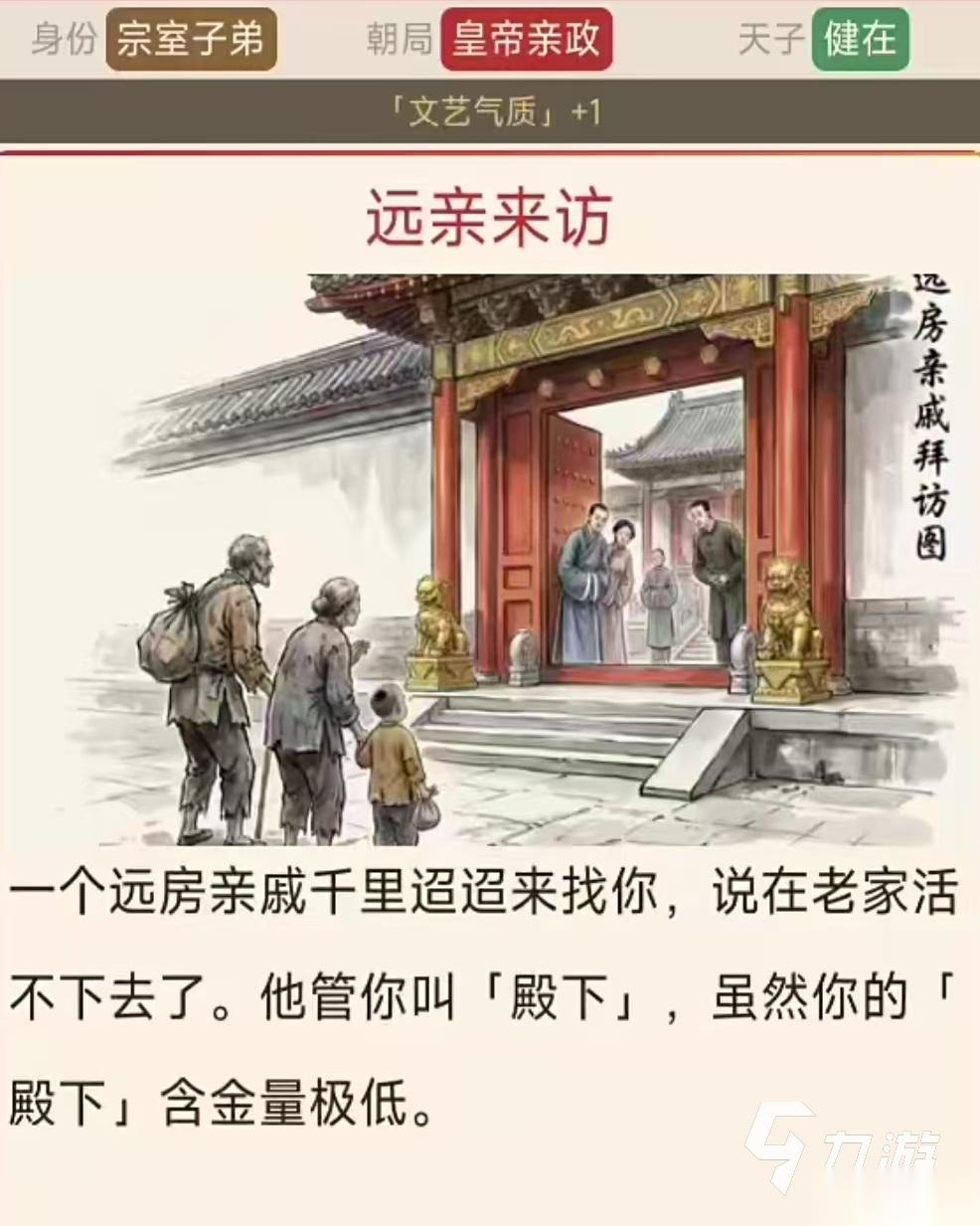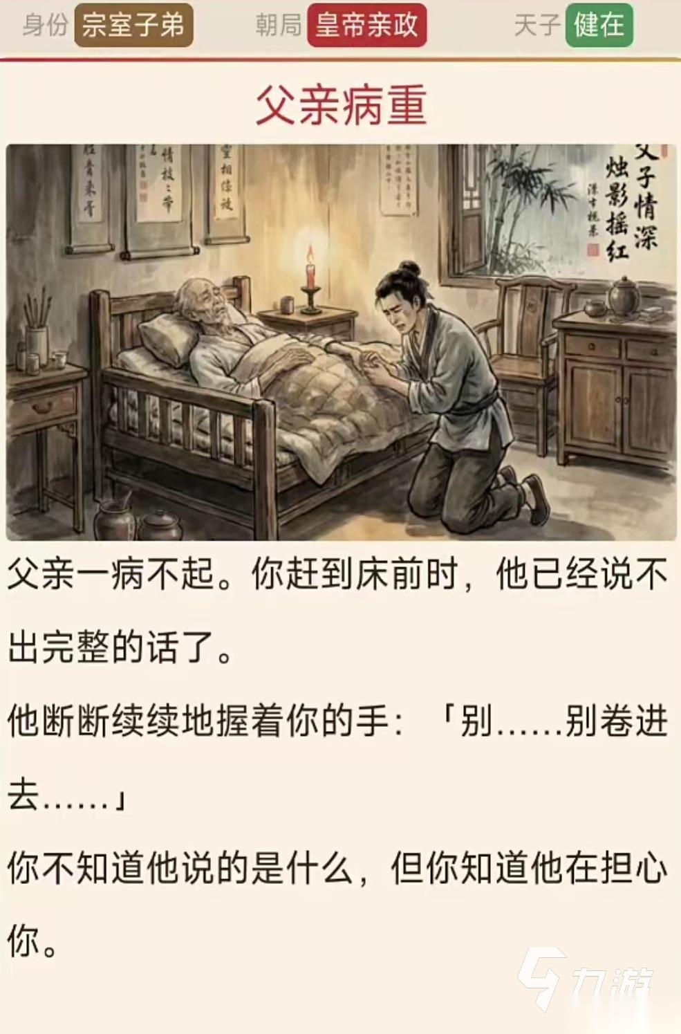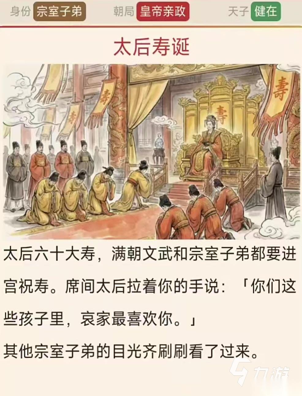 游戏讲述的是从少年到人生最后这一段时光的故事,从一开始就面临着一个个的选择。例如封地分配,玩家可以选择主动申请去最偏远的封地,也可以想办法留在京城。例如当天子蒙尘之后,可以选择挺身而出回京主持大局,也可以建立拥立皇帝之子。这些做出的每一个选择都会影响名望、危险、自由等核心属性的加成,每一次选择都会影响后续的剧情走向。
