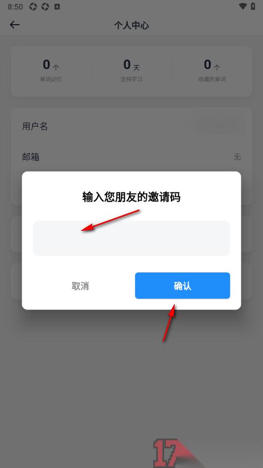 4.在页面上弹出的输入框中,需要将获取到的朋友的邀请码信息详细的输入到输入框中,然后点击【确认】按钮即可完成。