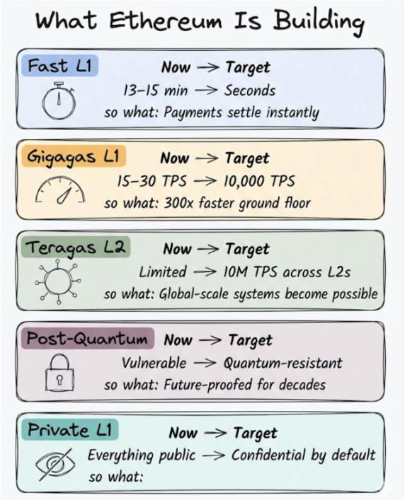 路线图把所有事都围绕五个目标来组织。以太坊已经在跑了,每天几十亿美元流过它。但能在上面建什么确实有限制,这五个目标就是要移除这些限制。