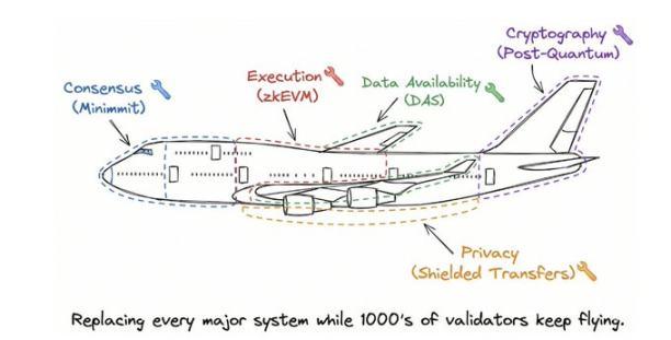 到 2029 年,系统的每个主要部分都会被替换。但任何时候都不会有「停下世界重写」的计划。目标是做向后兼容的升级,换木板的时候链还能继续跑,虽然每次升级还是需要运营者更新软件,边缘情况也可能变化。这是一场伪装成渐进式升级的彻底重建。准确地说,当共识和执行逻辑被重建时,状态(用户余额、合约存储和历史记录)会在所有分叉中保留下来。这艘「船」在运送「货物」的同时被重建。