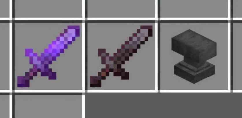 2、使用已经附魔的装备转移附魔属性,这里需要用到的材料铁砧、两件相同的装备(这里使用两把剑,两件装备中至少有一个有附魔属性)、经验(在生存模式中)