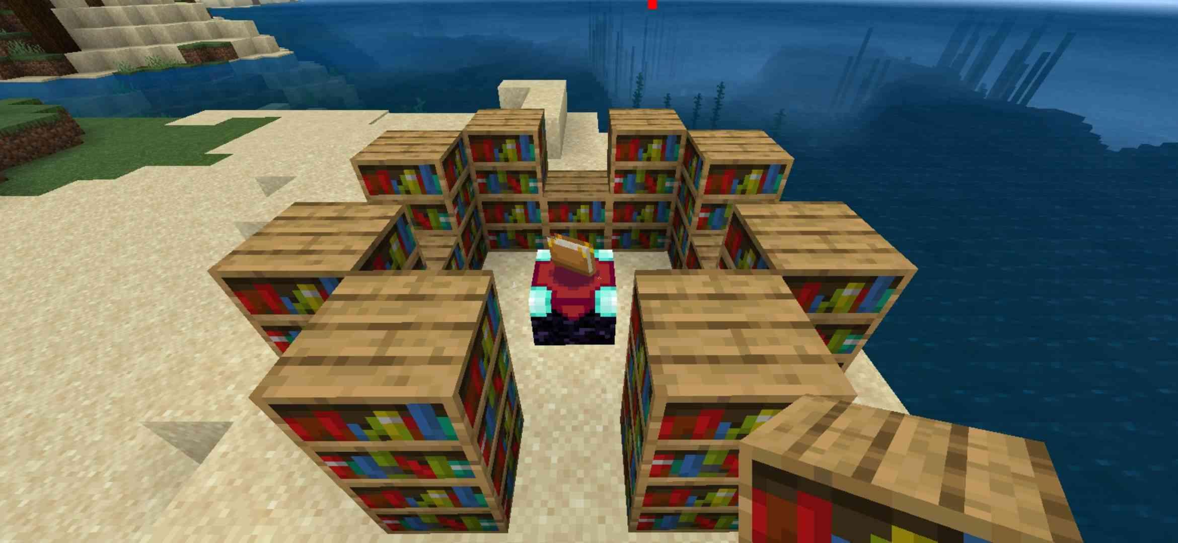 (1)、将附魔台放在中间,书架围绕他转一圈(最好有16个,这样可以得到满级附魔)。