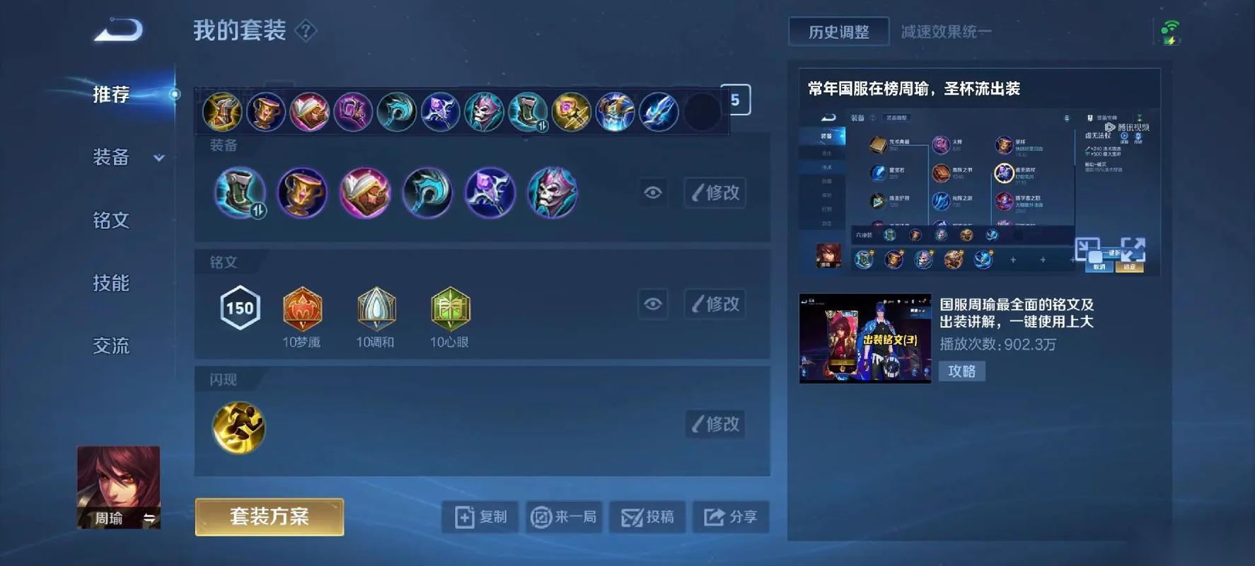 半肉持续流出装,更注重生存与续航能力。首件选择抵抗之靴减少控制时长,随后做出时之预言提升双抗与生命值。极寒风暴提供冷却缩减让技能释放频率最大化,配合痛苦面具的持续灼烧,在阵地战中消耗能力很强。面对敌方法刺英雄时,魔女斗篷的护盾可有效规避秒杀。不死鸟之眼则能强化周瑜在火区内的回血效果,让其在持续作战中几乎无需回城。这套出装容错率拉满,适合应对多突进或多控制阵容。