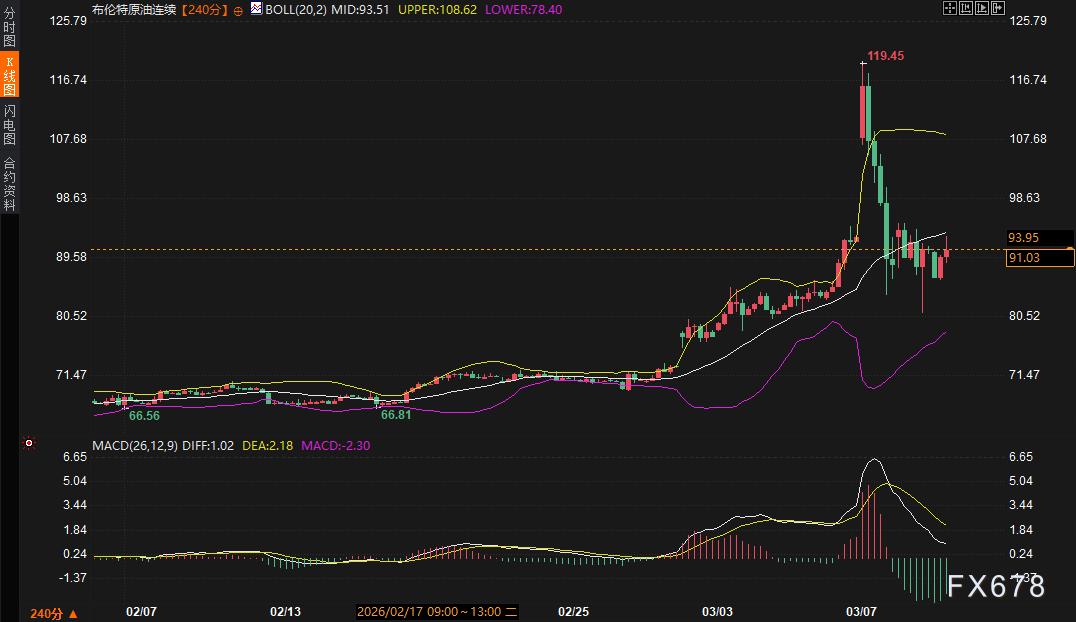 技术分析:240分钟级别显示,布伦特原油从119.45美元的极端高位回撤后,目前在91.03美元附近波动。MACD死叉状态尚未完全消散,显示空头余威犹存,但K线紧贴布林带中轨运行,反映出市场在暴跌28美元后的调仓需求。