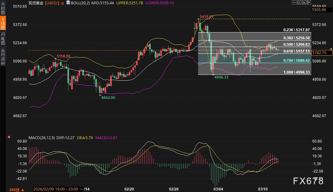 支撑阻力区间:下方支撑:5155-5157美元(布林带中轨与斐波那契0.618重合区)。