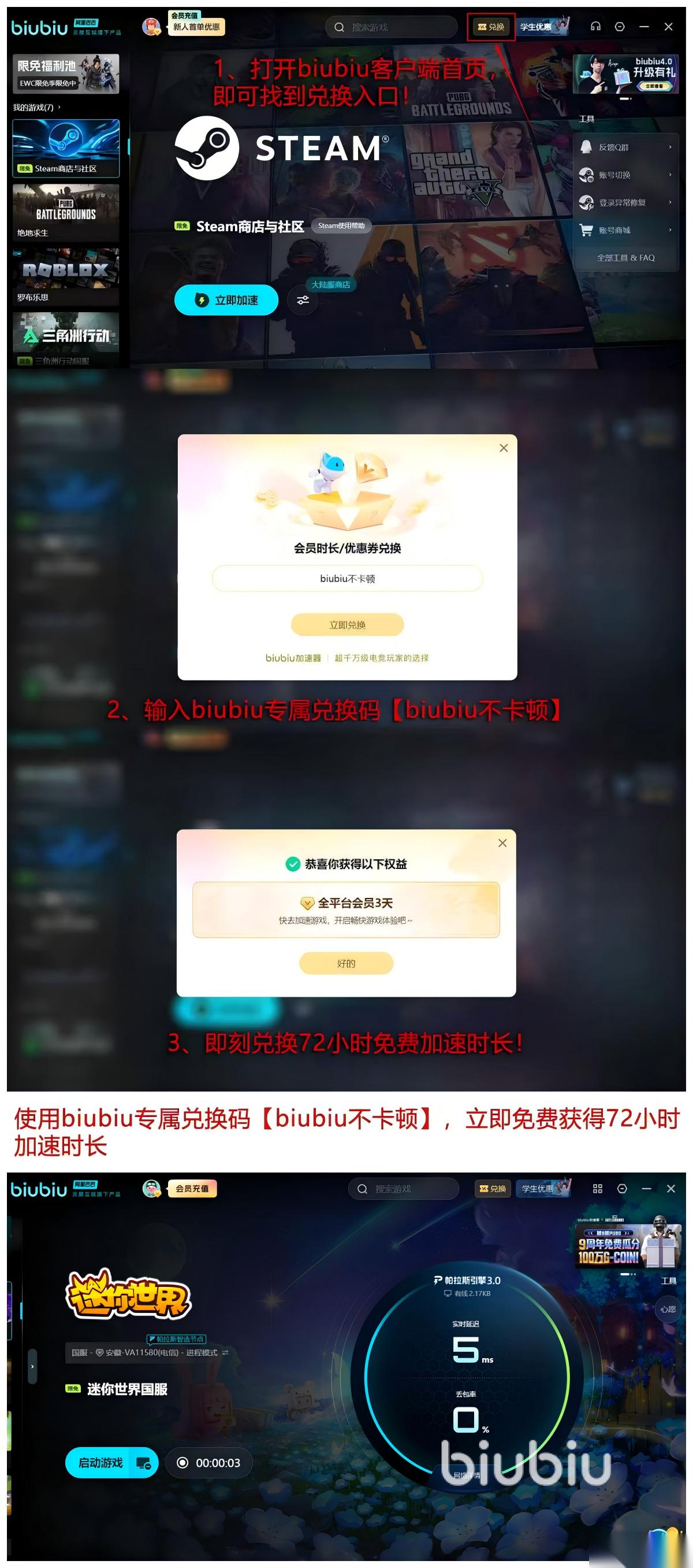 可以获取的福利有【biubiu不卡顿】口令,大家能够领取72小时的时间保证运行的效率,同时还能累计新人用户获取的加速福利24小时,总计能够获得96小时的加速时间,这些时间对于各位来说一定是非常的有用的,保障各位想体验再购买,以实力说服各位购买。