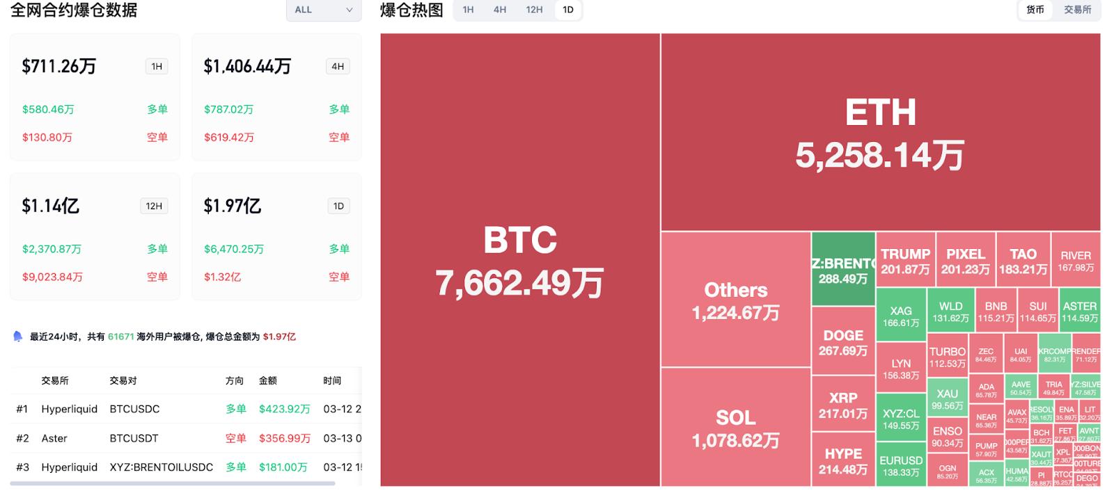 24小时爆仓数据:全球共61671人被爆仓,爆仓总金额为1.97亿美元,其中BTC爆仓7662万美元、ETH爆仓5258万美元、SOL爆仓1078万美元。